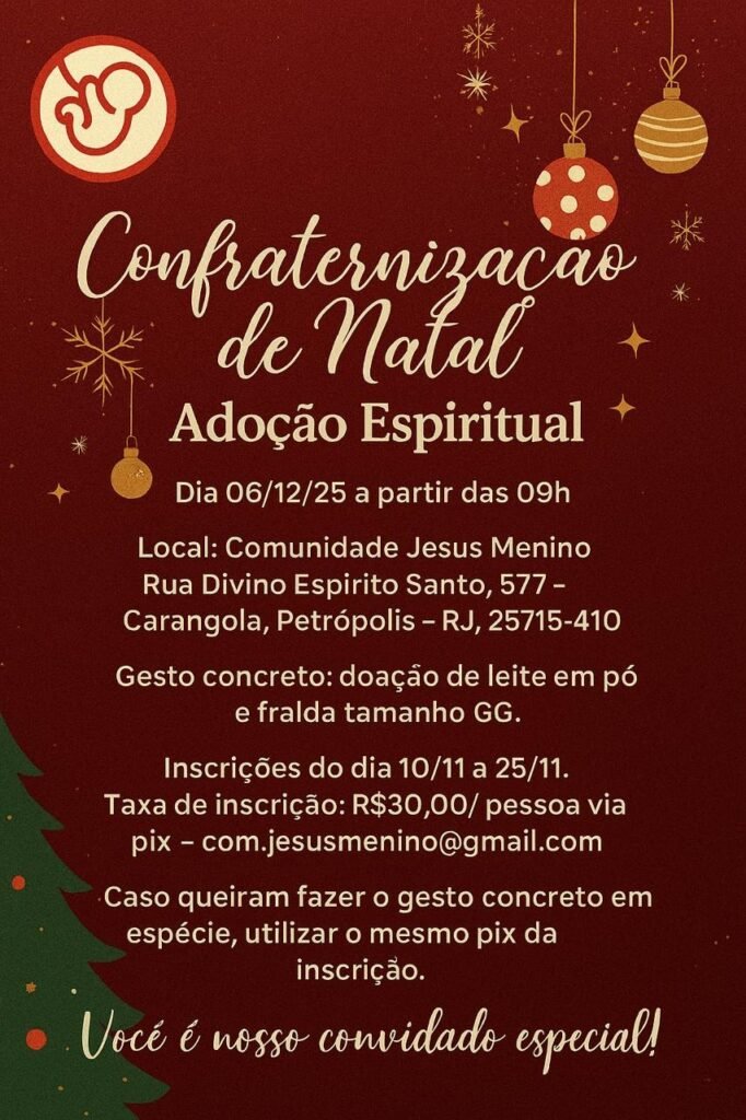 O tempo do Natal se aproxima e queremos viver este momento de graça ao lado de cada filho, família, voluntário e amigo da nossa comunidade.Com muita alegria, convidamos você para a nossa Confraternização de Natal, um encontro preparado com carinho, partilha e presença. Que este dia seja um espaço de fraternidade, luz e acolhimento, celebrando […]