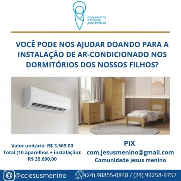 Estamos realizando uma campanha para a instalação de ar-condicionado nos dormitórios da Comunidade Jesus Menino, e você pode fazer parte dessa missão! Cada doação, independente do valor, nos aproxima de um ambiente mais digno e acolhedor para eles. 📲 Contribua pelo PIX: com.jesusmenino@gmail.com🙏 Compartilhe e nos ajude a espalhar essa corrente de amor!